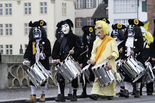 Während der „drey scheenschte Däg“ kommt Basel nicht zur Ruhe. Tag und Nacht sind die Tambouren und Piccolospieler mit den Pappmachémasken unterwegs. Alle Fotos: Wulf Wager