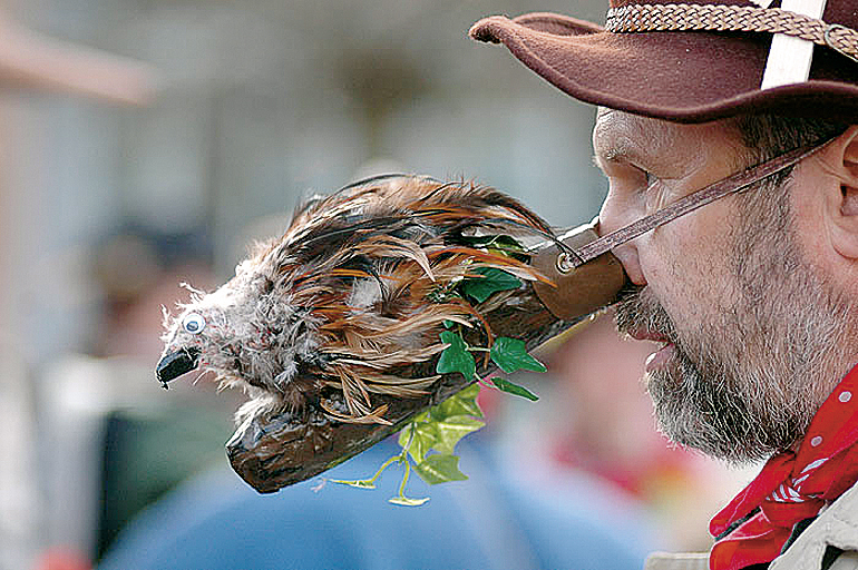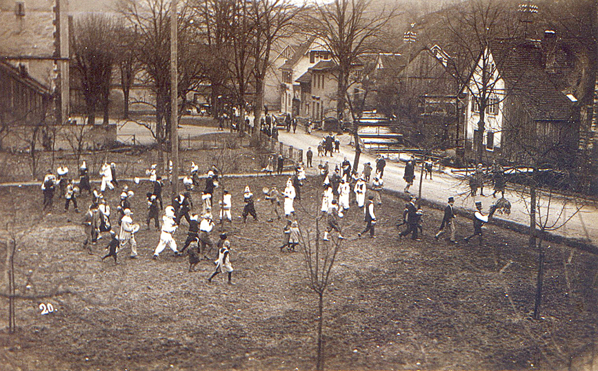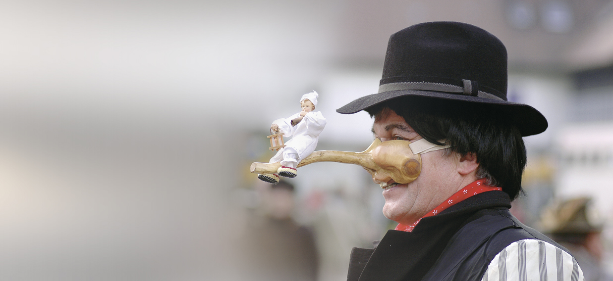 | Der Wolfacher Nasenzug von Frank Schrader Der Nasenzug in Wolfach beginnt am Fasnetzieschtig um 17 Uhr vor dem Stadtwall bei der Gastwirtschaft Zum Herrengarten. Es versammeln sich dort bis zu 350 Männer, ausgestattet mit einer möglichst fantasievoll gestalteten Nase, einer meist von einem alten Anzug stammenden Jacke, deren Futter nach außen gewendet ist, einem Krachinstrument und einem Hut, der mit einem „Reifschniiderspän“, einem Holzspan, der beim Herstellen hölzerner Fassreifen entsteht, geziert ist.