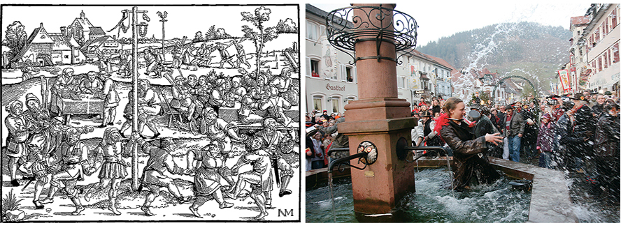 Der Kupferstecher, Zeichner, Maler und Holzschneider Hans Sebald Beham (1500–1550) fertigte 1534 den Holzschnitt „Der Nasentanz zu Gimpelsbrunn“, der ein Gedicht des Nürnberger Dichters Hans Sachs (1494–1576) illustriert. Darauf zu sehen ist ein Reigen von sieben Männern und einer Frau, die, von Musikanten begleitet, im Gänsemarsch herumspringen. Auf einem um 1540 entstandenen Holzschnitt des Augsburger „Formenschneyders“ Anthony Corthoys ist der „Nasentanz“ zwischen einem Narren mit Eselsohrenkappe und seiner Base dargestellt. Hans Sachs schrieb 1550 über das Thema, ein „Fasnacht spil, das ist mit 9 Personen zu spiln und haiset der Nasentanz“, in dem der Schultheiß einen Wettbewerb auslobt und den Männern mit den drei größten Nasen einen Gewinn verspricht. Nun treten nacheinander mehrere Männer hervor und preisen ihre jeweiligen überdimensionierten Riechorgane. |