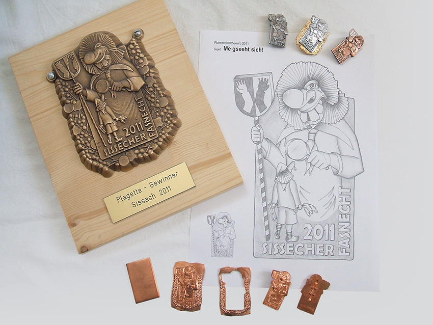 Zum Tanz mit den Madamas Speziell in der Schweiz werden Wettbewerbe zur Gestaltung von Fasnachtsplaketten öffentlich ausgeschrieben (Basel, Liestal, Solothurn usw.). Oder man lädt eine kleine Schar von Zeichnern direkt dazu ein (Allschwil usw.). Auf der badischen Seite des Rheins findet man solche Wettbewerbe kaum. Hier wird die Gestaltung oft als fixe Auftragsarbeit vergeben. Mancherorts wird das Sujet gleich mit der Einladung geliefert oder bei der Ausschreibung genannt. In anderen Fällen ist das Motto offen – hier muss sich der Gestalter mit den örtlichen Begebenheiten auseinandersetzen und versuchen, ein Thema zu finden, das ein halbes Jahr später noch immer aktuell sein wird. Dies ist schwieriger, aber umso reizvoller. Oft werden Vorgaben gemacht wie das Wort „Fasnacht“, die Jahreszahl, das Ortswappen oder Gebäude, die einzuarbeiten sind. In der Regel wird eine Reliefzeichnung in Din A 4 und in Originalgröße gefordert. Die Darstellung der verschiedenen Ausführungen (Kupfer, Silber, Gold etc.) helfen bei der Auswahl. Oft sammelt ein sogenannter Plakettenchef die Entwürfe und legt sie anonym einem Gremium vor. Dieses Gremium hat nun die Qual der Wahl: So liegen dem Basler Fasnachtscomité jedes Jahr zwischen 70 und 100 Entwürfe vor! Ist die Auswahl getroffen und die Identität des Künstlers festgestellt, gibt es auch etwas zu gewinnen: z. B. den kompletten Plakettensatz und/oder Preisgelder in teils recht reizvoller Höhe … Aha! Daher weht der Wind! Es geht ums Geld! Nein, nicht wirklich. Wobei: natürlich würde keiner der Gestalter dazu nein sagen … Preisgelder sind allerdings nicht die Regel. Für einen Vollblutfasnächtler gibt es wohl keine größere Ehre, als dass „seine“ Plakette an der Fasnacht getragen wird. Man wird regelrecht süchtig: Hat man einmal einen Treffer gelandet, so kommt man ohne Weiteres auf 15 bis 20 Entwürfe pro Jahr. Zudem entwickelt man eine Art Paranoia und hofft, dass ein erfolgreicher Entwurf nicht in den Folgejahren kopiert wird bzw. dass man selber nicht (wenn auch unbewusst) eine bereits bestehende Plakette kopiert. Das hat in der Vergangenheit schon manch hohe Welle geschlagen: zuletzt in Basel, als man der 2011er „Puzzle-Plakette“ den Vorwurf des Plagiates machte. Das hört natürlich kein Künstler und keine Fasnachtsgesellschaft gerne, kommt aber durchaus vor. Fasnacht ist eben eine ernste Sache … Lebenswichtig für die Gesellschaften … Alle angefragten Gesellschaften betonen, wie überlebenswichtig das Plakettengeschäft für sie ist: Es bildet die Haupteinnahmequelle, mit der die Kosten für die fasnächtliche Infrastruktur (Verkehrs- und Sanitätsdienste, Absperrungen, Versicherungen etc.) gedeckt werden. Ein Wegbrechen ließe sich weder kurz- noch mittelfristig überbrücken. Man müsste die Mitgliedsbeiträge drastisch erhöhen und Sponsoren akquirieren. Sponsoring wird allerdings mehrheitlich abgelehnt – aus Furcht die „fasnächtliche Freiheit“ zu verlieren. Getreu dem Motto: „Wes Brot ich ess, des Lied ich sing.“ Die Plakette garantiert somit eine gewisse Unabhängigkeit. Die Abgabe der Plaketten innerhalb der Zünfte ist verschieden: Während manche feste Verteilerschlüssel und Mindestabnahmemengen kennen, verteilen andere nach Bedarf an ihre angeschlossenen Gruppen. Tatsächlich partizipieren diese sowohl direkt als auch indirekt an den Verkäufen: Sind die Infrastrukturkosten gedeckt, wird der verbleibende Überschuss verteilt. Mancherorts sind daran Bedingungen geknüpft: Wurde an allen Veranstaltungen teilgenommen? Wie originell wurde das eigene Sujet umgesetzt? Hierfür gibt es Subventionen. In Basel wacht hierüber das Comité mit Argusaugen. Die tatsächliche Verteilung ist eines der bestgehüteten Geheimnisse Basels: Man spricht nicht darüber … … und den Hersteller Ein Zusammenbruch des Plakettengeschäftes würde auch den Hersteller schwer treffen: Daniel Müller, Geschäftsführer der Rene Müller AG in Basel, erklärt, dass die Einnahmen aus der Herstellung circa zwei Drittel des Jahresumsatzes betragen. Ohne diese müsste man „80 Prozent der Belegschaft entlassen“. Und obwohl das Unternehmen auch auf Zinnwaren, Pokale, Schlüsselanhänger und Ähnliches spezialisiert ist. Aber alleine für die Herstellung von Plaketten werden jährlich um die 15 Tonnen (!) Kupferblech verarbeitet. Die Dienstleistung des Herstellers beginnt denn auch früh: So fungiert er mancherorts als technischer Berater bereits bei der Auswahl. Bevor die Plakette in Produktion geht, muss vom Graveur ein Gipsmodell erstellt werden. Das ist filigrane Handarbeit (oder eher: eine Kunst) und nimmt 10 bis 12 Stunden in Anspruch. Nach der Abnahme durch den Auftraggeber wird als nächstes eine Kunstoff-Matrize erstellt, welche die Grundlage für die Prägung bildet. Sind Prägewerkzeug und -stempel angefertigt, beginnt die eigentliche Produktion: Bis zu zehn Arbeitsschritte durchläuft die Plakette, vom Prägen, Ausstanzen über das Patinieren und Abbürsten bis hin zur Lackierung. Der Anteil an Handarbeit ist hoch: „Es gibt keinen Computer, in den man vorne das Metall hineinwirft und hinten die fertige Plakette herauskommt“, so Daniel Müller. So muss der „Blaggeddemüller“ für drei Monate zusätzliches Personal einstellen. Der lang ersehnte Augenblick ist da Ist die Plakette dann ausgeliefert, wird sie der Öffentlichkeit vorgestellt. Beachtlich hierbei ist, welch große Bedeutung ihr gerade in der Schweiz zuteil wird: Dort wird sie auf feierlichen Vernissagen gebührend präsentiert. In Basel ziert sie tags darauf gar die Titelseite der Basler Zeitung und sorgt alljährlich für tagelange Diskussionen über ihren künstlerischen Wert. Das ist der Moment auf den der Zeichner gewartet hat: Endlich ist sie da! Wie wird sie wohl von den Fasnächtlern aufgenommen? Selbstredend, dass ein deutscher Plakettenkünstler in der Schweiz für ordentlich Gesprächsstoff sorgt …